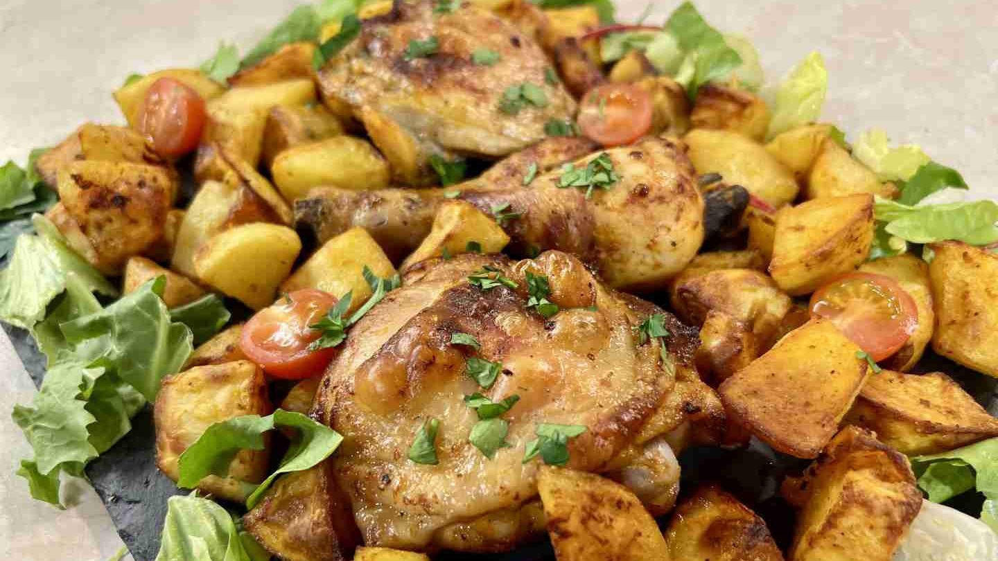 Muslos de pollo con patatas crujientes.